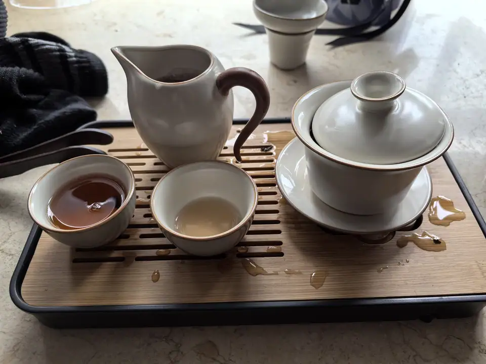 "This tea set embodies quiet elegance. The pure white porcelain with its delicate gold rim catches the light beautifully, and the wooden tray adds a warm, natural contrast. I’ve used the sharing pitcher daily—it pours cleanly, and the dark handle offers a secure grip. The set feels cohesive and balanced, especially when arranged simply against the dark backdrop. It’s become the heart of my morning ritual; watching tea flow into the cup is a moment of calm. Understated, refined, and deeply soothing."