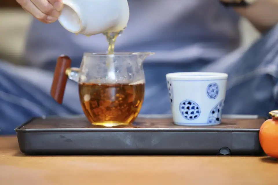 "There’s a quiet ceremony in pouring this tea from the white porcelain pot into the glass pitcher, watching the golden-amber liquor catch the light like liquid sunshine. The wooden handle feels warm in my hand, and the blue-patterned cup waiting beside the vibrant persimmon adds a touch of rustic charm to the moment. The aroma is an enchanting blend of ripe peaches and wild honey—inviting and warm. But the first sip is where the magic unfolds: a silky texture carries flavors of caramelized apricot and a hint of toasted barley, finishing with a clean, mineral freshness that lingers like a soft echo of mountain spring water. There’s no bitterness—just a natural sweetness that revitalizes the senses. What captivates me is how the tea’s simplicity lets its quality shine. Served in this harmonious setup, every cup feels like a tranquil pause. It’s not just a beverage—it’s liquid artistry from the tea gardens of Fujian."