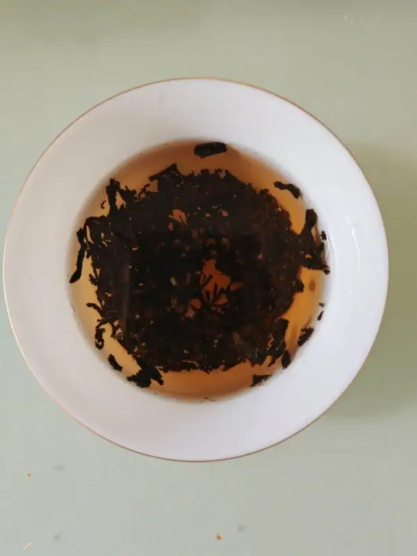 “There’s a quiet sophistication in observing the presentation of this tea. The dry leaves rest elegantly in a white ceramic plate with a delicate gold rim, their dark, tightly curled forms contrasting beautifully against the simple sage-green background. When brewed, the tea transforms into a luminous amber liquor in a matching white-and-gold cup, where the leaves unfurl like tiny sails in the sunlit liquid.